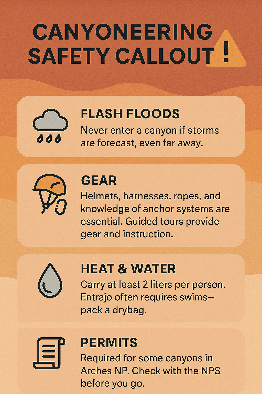 • Permits: Required for some canyons in Arches NP. Check with the NPS before you go.